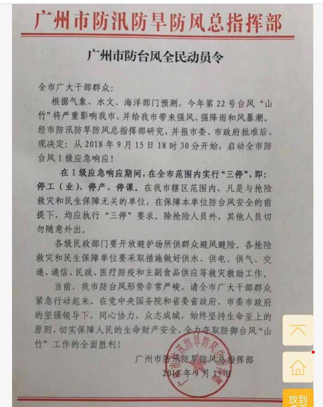 9.15日,本年度超强台风“山竹”逼近广东,预计在16日下午登陆,中心风力预计达17级。 广州市政府决定2018年9月15日18时30分开始,启动全市防台风I级应急响应,在I级应急响应期间,在全市范围内实行“三停”,即:停工(业)、停产、停课。同时,广东全省各市先后发出不同程 度的台风预警信号,要求市民做好防御工作,保证人身财产安全。
